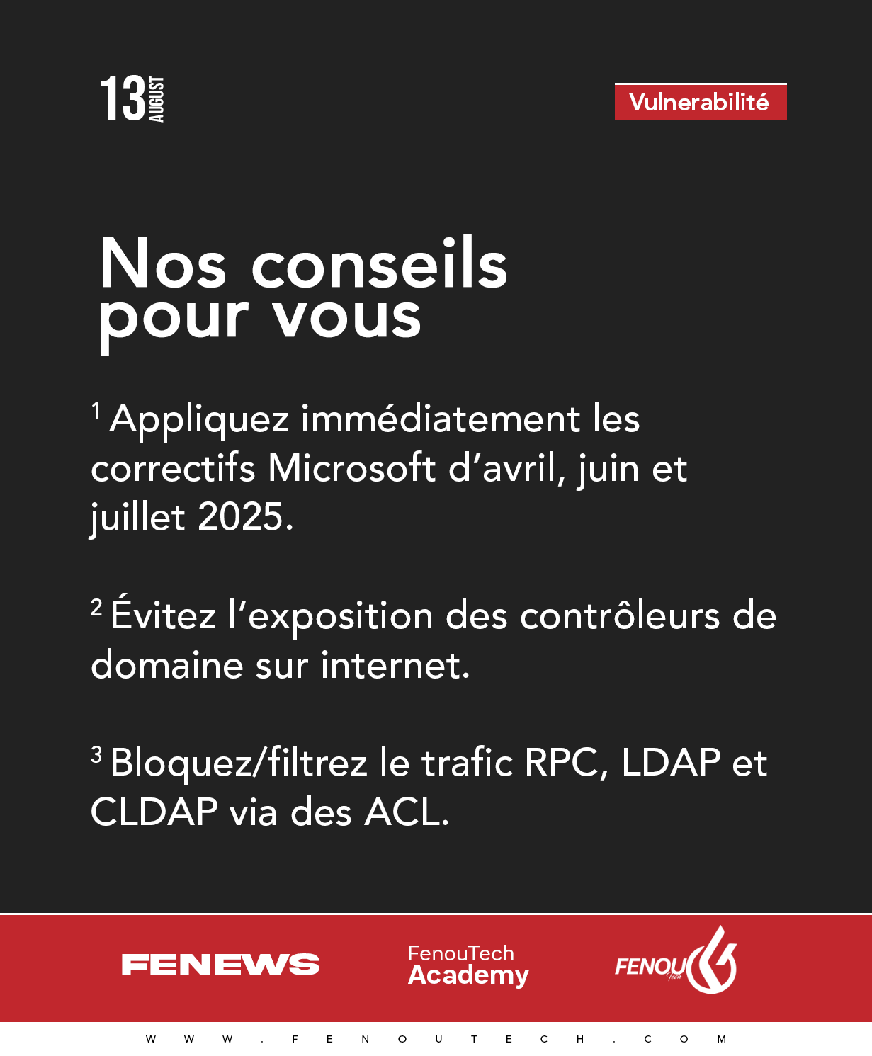 SafeBreach a également identifié quatre vulnérabilités de type DoS : trois peuvent être déclenchées à distance par des attaquants non authentifiés, tandis que la quatrième nécessite simplement des privilèges utilisateurs limités Help Net Security. Parmi elles figure la CVE-2025-32724, qui provoque une exploitation excessive de ressources (memory exhaustion) via LSASS, permettant aux DCs de participer à des attaques DDoS massives Help Net Security.